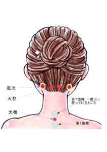 風邪のひき始めは、首のつけ根にある 大椎(だいつい) が冷えて抵抗力が落ちやすいと考えます。